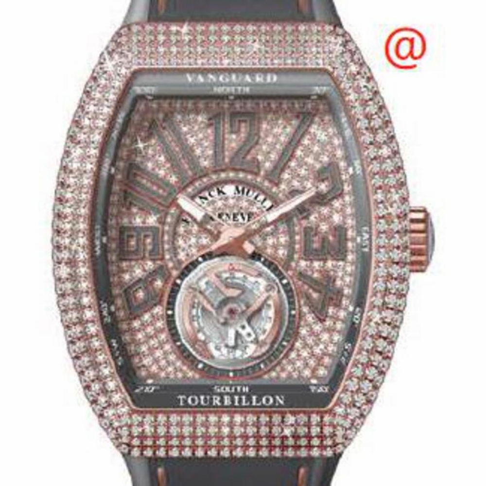 Rose gold-tone 18kt rose gold case with a grey alligator band. Fixed rose gold-tone bezel with diamond set 18kt rose gold. Grey dial with rose gold-tone hands and Arabic numeral hour markers. Dial Type: Analog. Luminescent hands and markers. Hand wind movement. Scratch resistant sapphire crystal. Transparent see through case back. Tonneau case shape, case size: 45 mm. Functions: hour, minute, second. Additional Info: original box, international warranty card, manual (complete accessories). Vanguard Tourbillon Series. Luxury watch style. Watch label: Swiss Made. Franck Muller Vanguard Tourbillon Hand Wind Diamond Grey Dial Mens Watch V45TDCD5NTT(DIAMTT5N).