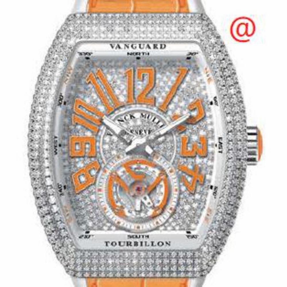 Silver-tone stainless steel case with a orange alligator band. Fixed silver-tone bezel with diamond set stainless steel. Orange dial with silver-tone hands and Arabic numeral hour markers. Dial Type: Analog. Luminescent hands and markers. Hand wind movement. Scratch resistant sapphire crystal. Transparent see through case back. Tonneau case shape, case size: 45 mm. Functions: hour, minute, second. Additional Info: original box, international warranty card, manual (complete accessories). Vanguard Tourbillon Series. Luxury watch style. Watch label: Swiss Made. Franck Muller Vanguard Tourbillon Hand Wind Diamond Orange Dial Mens Watch V45TDCDACOR(DIAMORAC).