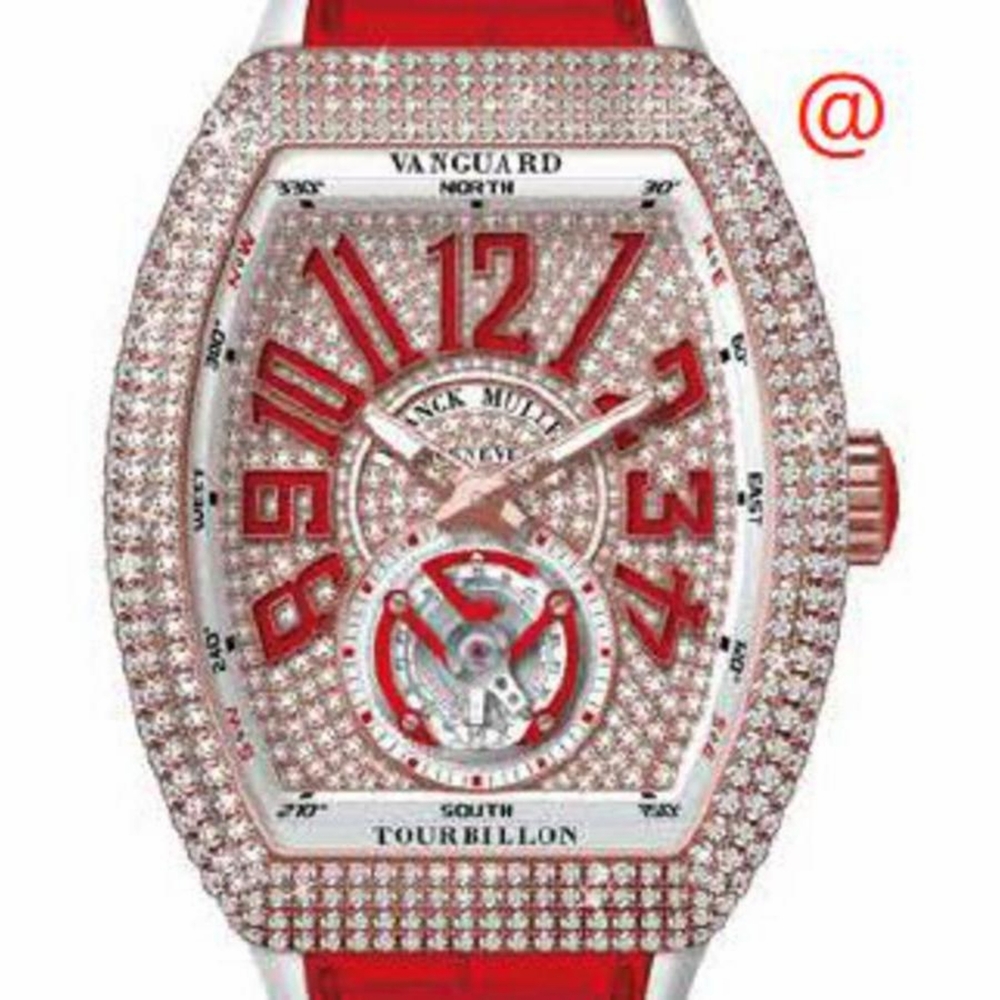 Rose gold-tone 18kt rose gold case with a red alligator band. Fixed rose gold-tone bezel with diamond set 18kt rose gold. Red dial with rose gold-tone hands and Arabic numeral hour markers. Dial Type: Analog. Luminescent hands and markers. Hand wind movement. Scratch resistant sapphire crystal. Transparent see through case back. Tonneau case shape, case size: 45 mm. Functions: hour, minute, second. Additional Info: original box, international warranty card, manual (complete accessories). Vanguard Tourbillon Series. Luxury watch style. Watch label: Swiss Made. Franck Muller Vanguard Tourbillon Hand Wind Diamond Red Dial Mens Watch V45TDCD5NRG(DIAMRGE5N).