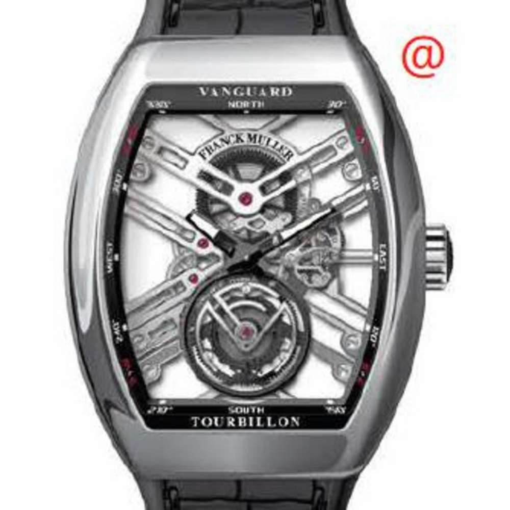 Silver-tone stainless steel case with a black alligator band. Fixed silver-tone stainless steel bezel. Transparent dial with black hands and Arabic numeral hour markers. Dial Type: Analog. Luminescent hands and markers. Hand wind movement. Scratch resistant sapphire crystal. Transparent see through case back. Tonneau case shape, case size: 44 mm. Functions: hour, minute, second. Additional Info: original box, international warranty card, manual (complete accessories). Vanguard Tourbillon Series. Luxury watch style. Watch label: Swiss Made. Franck Muller Vanguard Tourbillon Hand Wind Mens Watch V45TSQTACNR(NRBLCRGE).