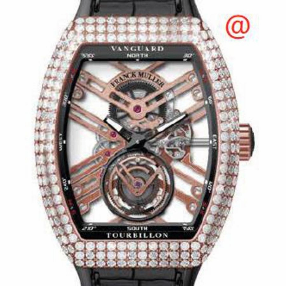 Rose gold-tone 18kt rose gold case with a black alligator band. Fixed rose gold-tone bezel with diamond set 18kt rose gold. Transparent dial with black hands and Arabic numeral hour markers. Dial Type: Analog. Luminescent hands and markers. Hand wind movement. Scratch resistant sapphire crystal. Transparent see through case back. Tonneau case shape, case size: 44 mm. Functions: hour, minute, second. Additional Info: original box, international warranty card, manual (complete accessories). Vanguard Tourbillon Series. Luxury watch style. Watch label: Swiss Made. Franck Muller Vanguard Tourbillon Hand Wind Diamond Mens Watch V45TSQTD5NNR(NRBLCRGE).