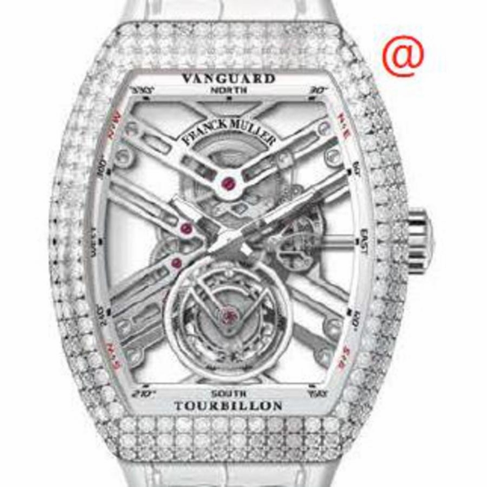 Silver-tone stainless steel case with a white alligator band. Fixed silver-tone bezel with diamond set stainless steel. Transparent dial with silver-tone hands and Arabic numeral hour markers. Dial Type: Analog. Luminescent hands and markers. Hand wind movement. Scratch resistant sapphire crystal. Transparent see through case back. Tonneau case shape, case size: 44 mm. Functions: hour, minute, second. Additional Info: original box, international warranty card, manual (complete accessories). Vanguard Tourbillon Series. Luxury watch style. Watch label: Swiss Made. Franck Muller Vanguard Tourbillon Hand Wind Diamond Mens Watch V45TSQTDACBC(BLCNRRGE).
