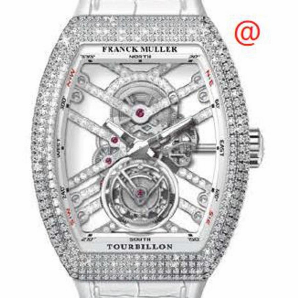 Silver-tone stainless steel case with a white alligator band. Fixed silver-tone bezel with diamond set stainless steel. Transparent dial with silver-tone hands and Arabic numeral hour markers. Dial Type: Analog. Luminescent hands and markers. Hand wind movement. Scratch resistant sapphire crystal. Transparent see through case back. Tonneau case shape, case size: 44 mm. Functions: hour, minute, second. Additional Info: original box, international warranty card, manual (complete accessories). Vanguard Tourbillon Series. Luxury watch style. Watch label: Swiss Made. Franck Muller Vanguard Tourbillon Hand Wind Diamond Mens Watch V45TSQTDMVTDACBC(BLCNRRGE).