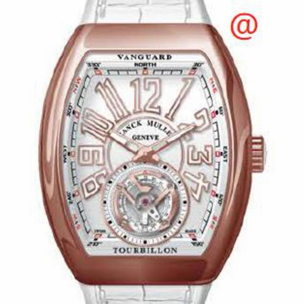 Rose gold-tone 18kt rose gold case with a white alligator band. Fixed rose gold-tone 18kt rose gold bezel. White dial with rose gold-tone hands and Arabic numeral hour markers. Minute markers around the outer rim. Dial Type: Analog. Luminescent hands and markers. Hand wind movement. Scratch resistant sapphire crystal. Transparent see through case back. Tonneau case shape, case size: 41 mm. Functions: hour, minute, second. Additional Info: original box, international warranty card, manual (complete accessories). Vanguard Tourbillon Series. Luxury watch style. Watch label: Swiss Made. Franck Muller Vanguard Tourbillon Hand Wind White Dial Mens Watch V41T5NBC(BLCBLC5N).