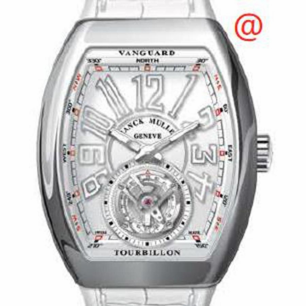 Silver-tone stainless steel case with a white alligator band. Fixed silver-tone stainless steel bezel. White dial with silver-tone hands and Arabic numeral hour markers. Minute markers around the outer rim. Dial Type: Analog. Luminescent hands and markers. Hand wind movement. Scratch resistant sapphire crystal. Transparent see through case back. Tonneau case shape, case size: 41 mm. Functions: hour, minute, second. Additional Info: original box, international warranty card, manual (complete accessories). Vanguard Tourbillon Series. Luxury watch style. Watch label: Swiss Made. Franck Muller Vanguard Tourbillon Hand Wind White Dial Mens Watch V41TACBC(BLCBLCAC).