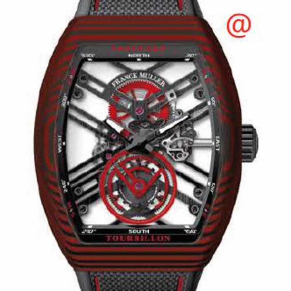 Black polycarbonate case with a black leather strap. Fixed black polycarbonate bezel. Transparent dial with black hands and Arabic numeral hour markers. Dial Type: Analog. Luminescent hands. Hand wind movement. Scratch resistant sapphire crystal. Transparent see through case back. Tonneau case shape, case size: 44 mm. Functions: hour, minute, second. Additional Info: original box, international warranty card, manual (complete accessories). Vanguard Series. Luxury watch style. Watch label: Swiss Made. Franck Muller Vanguard Hand Wind Mens Watch V45TSQTCARRGNR(NRBLCRGE).