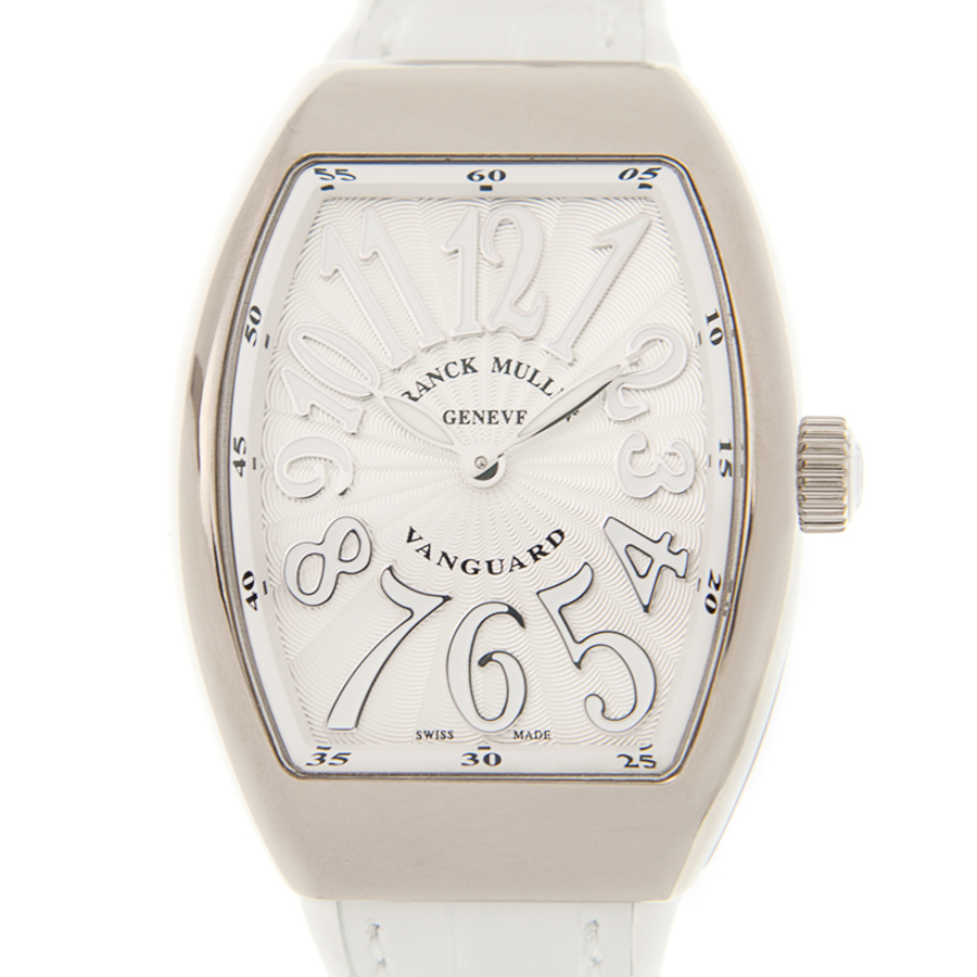 18kt white gold case with a white leather strap. Fixed 18kt white gold bezel. Silver-tone dial with silver-tone leaf-style shape hands and Arabic numeral hour markers. Dial Type: Analog. Luminescent hands. Quartz movement. Scratch resistant sapphire crystal. Screw down crown. Solid case back. Tonneau case shape. Case size: 32 mm. Pin buckle clasp. Water resistant at 30 meters / 100 feet. Functions: hour, minute. Additional Info: original box, international warranty card, manual (complete accessories). Luxury watch style. Watch label: Swiss Made. Franck Muller Vanguard Quartz Silver Dial Unisex Watch V32QZ(OG.BC).