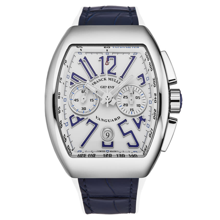 Silver-tone stainless steel case with a blue rubber strap. Fixed silver-tone stainless steel bezel. White dial with silver-tone hands and Arabic numeral hour markers. Minute markers around the outer rim. Dial Type: Analog. Luminescent hands and markers. Date display at the 6 o'clock position. Chronograph - two sub-dials displaying: 60 second and 30 minute. Automatic movement. Scratch resistant sapphire crystal. Screw down crown. Solid case back. Tonneau case shape, case size: 45 mm, case thickness: 16 mm. Band width: 27 mm, band length: 8 inches. Deployment with push button release clasp. Functions: chronograph, date, hour, minute, second. Vanguard Series. Luxury watch style. Watch label: Swiss Made. Franck Muller Vanguard Chronograph Automatic White Dial Mens Watch 45CCWHTBLU-2.