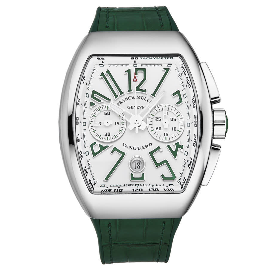 Silver-tone stainless steel case with a black rubber strap. Fixed silver-tone stainless steel bezel. White dial with silver-tone hands and Arabic numeral hour markers. Minute markers around the outer rim. Dial Type: Analog. Luminescent hands and markers. Date display at the 6 o'clock position. Chronograph - two sub-dials displaying: 60 second and 30 minute. Automatic movement. Scratch resistant sapphire crystal. Screw down crown. Solid case back. Tonneau case shape, case size: 45 mm, case thickness: 16 mm. Band width: 27 mm, band length: 8 inches. Deployment with push button release clasp. Water resistant at 30 meters / 100 feet. Functions: chronograph, date, hour, minute, second. Vanguard Series. Luxury watch style. Watch label: Swiss Made. Franck Muller Vanguard Chronograph Automatic White Dial Mens Watch 45CCWHTGRN.