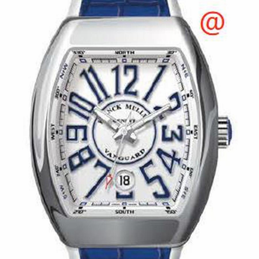 Silver-tone stainless steel case with a blue alligator band. Fixed silver-tone stainless steel bezel. White dial with silver-tone hands and Arabic numeral hour markers. Minute markers around the outer rim. Dial Type: Analog. Luminescent hands and markers. Date display at the 6 o'clock position. Automatic movement. Scratch resistant sapphire crystal. Tonneau case shape, case size: 41 mm. Functions: date, hour, minute, second. Additional Info: original box, international warranty card, manual (complete accessories). Vanguard Series. Luxury watch style. Watch label: Swiss Made. Franck Muller Vanguard Automatic White Dial Mens Watch V41SCDTACBU(BLCBLAC).