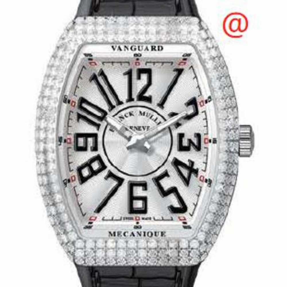 Silver-tone stainless steel case with a black alligator band. Fixed silver-tone bezel with diamond set stainless steel. White dial with silver-tone hands and Arabic numeral hour markers. Minute markers around the outer rim. Dial Type: Analog. Luminescent hands and markers. Automatic movement. Scratch resistant sapphire crystal. Tonneau case shape, case size: 41 mm. Functions: hour, minute. Additional Info: original box, international warranty card, manual (complete accessories). Vanguard Series. Luxury watch style. Watch label: Swiss Made. Franck Muller Vanguard Automatic Diamond White Dial Mens Watch V41SDACNR(BLCNRAC).