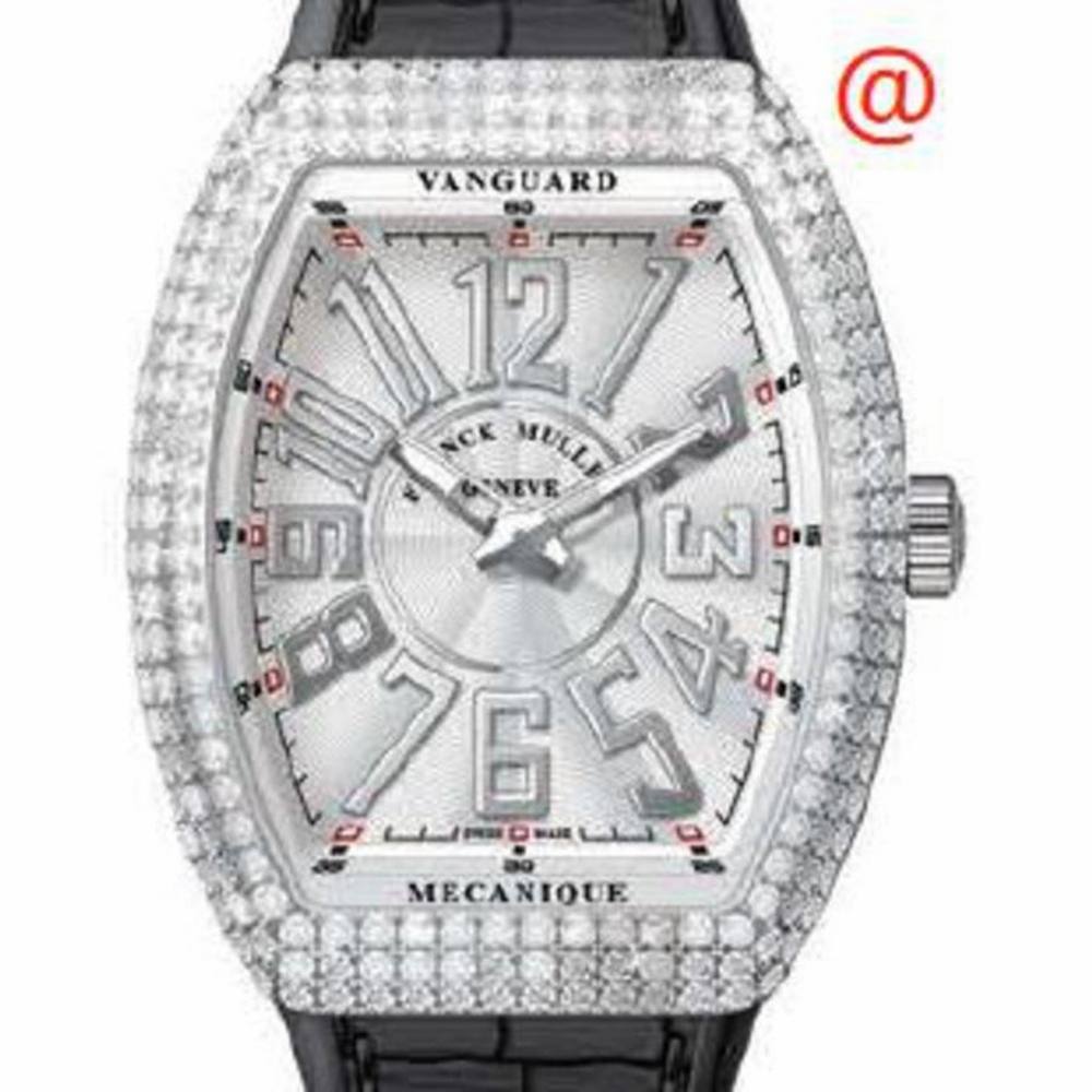 Silver-tone stainless steel case with a black alligator band. Fixed silver-tone bezel with diamond set stainless steel. White dial with silver-tone hands and Arabic numeral hour markers. Minute markers around the outer rim. Dial Type: Analog. Luminescent hands and markers. Automatic movement. Scratch resistant sapphire crystal. Tonneau case shape, case size: 41 mm. Functions: hour, minute. Additional Info: original box, international warranty card, manual (complete accessories). Vanguard Series. Luxury watch style. Watch label: Swiss Made. Franck Muller Vanguard Automatic Diamond White Dial Mens Watch V41SRELDACNR(BLCAC).