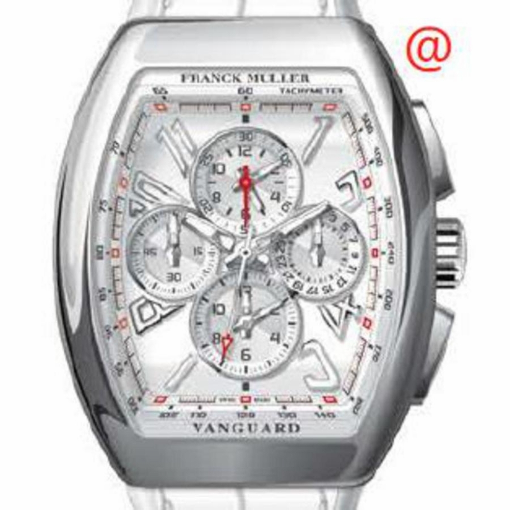 Silver-tone stainless steel case with a white alligator band. Fixed silver-tone stainless steel bezel. White dial with silver-tone hands and Arabic numeral hour markers. Minute markers around the outer rim. Dial Type: Analog. Luminescent hands and markers. Date display at the 3 o'clock position. Automatic movement. Scratch resistant sapphire crystal. Tonneau case shape, case size: 45 mm. Functions: chronograph, date, hour, minute, second. Additional Info: original box, international warranty card, manual (complete accessories). Vanguard Series. Luxury watch style. Watch label: Swiss Made. Franck Muller Vanguard Chronograph Automatic White Dial Mens Watch V45CCMBACBC(BLCBLCAC).