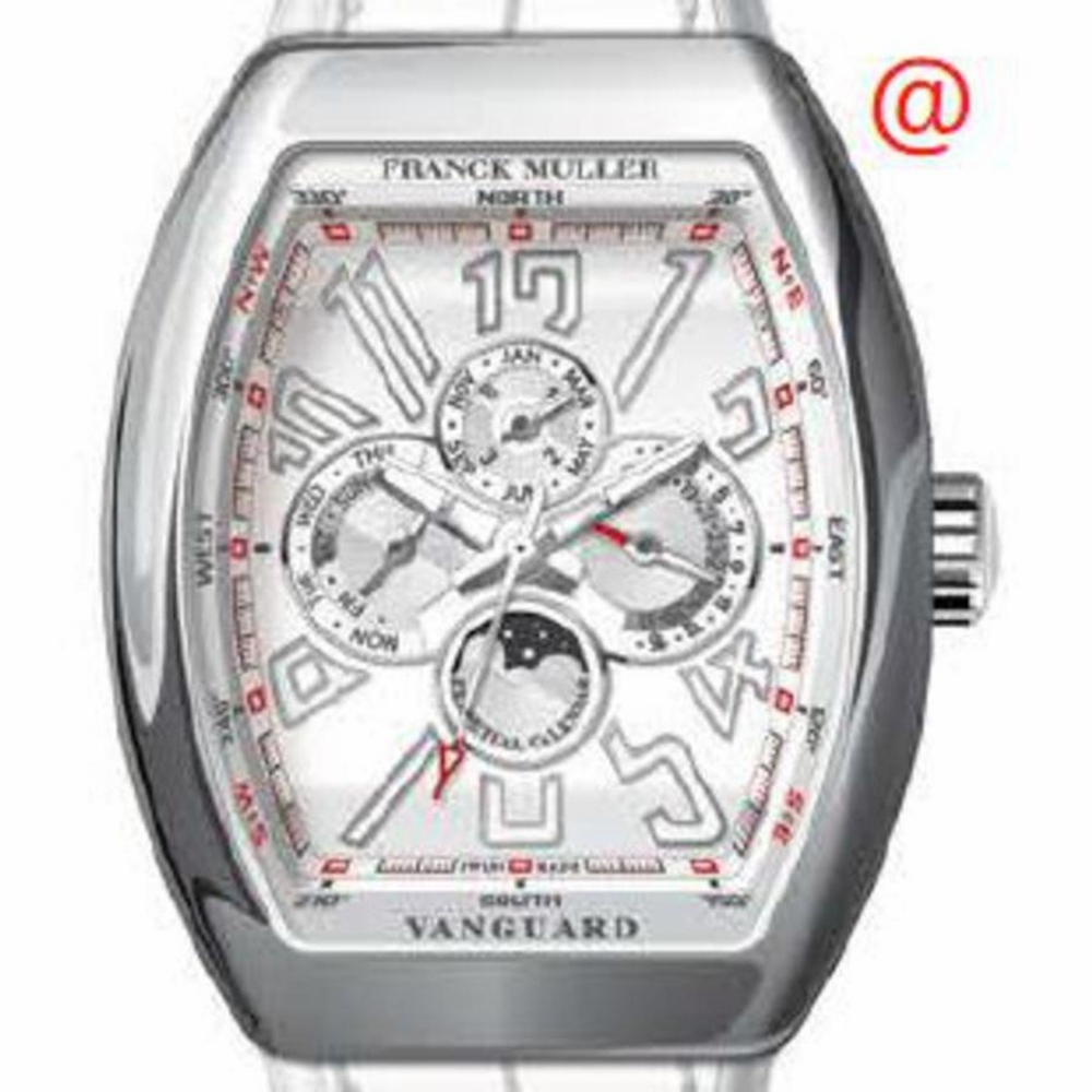 Silver-tone stainless steel case with a white alligator band. Fixed silver-tone stainless steel bezel. White dial with silver-tone hands and Arabic numeral hour markers. Dial Type: Analog. Luminescent hands and markers. Automatic movement. Scratch resistant sapphire crystal. Tonneau case shape, case size: 45 mm. Functions: month, date, day, hour, minute, second. Additional Info: original box, international warranty card, manual (complete accessories). Vanguard Series. Luxury watch style. Watch label: Swiss Made. Franck Muller Vanguard Automatic White Dial Mens Watch V45QPACBC(BLCBLCAC).