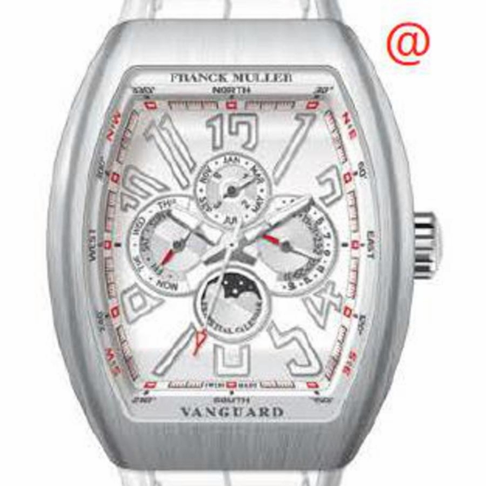 Silver-tone stainless steel case with a white alligator band. Fixed silver-tone stainless steel bezel. White dial with silver-tone hands and Arabic numeral hour markers. Minute markers around the outer rim. Dial Type: Analog. Luminescent hands and markers. Automatic movement. Scratch resistant sapphire crystal. Tonneau case shape, case size: 45 mm. Functions: month, date, day, hour, minute, second. Additional Info: original box, international warranty card, manual (complete accessories). Vanguard Series. Luxury watch style. Watch label: Swiss Made. Franck Muller Vanguard Automatic White Dial Mens Watch V45QPACBRBC(BLCBLCACBR).