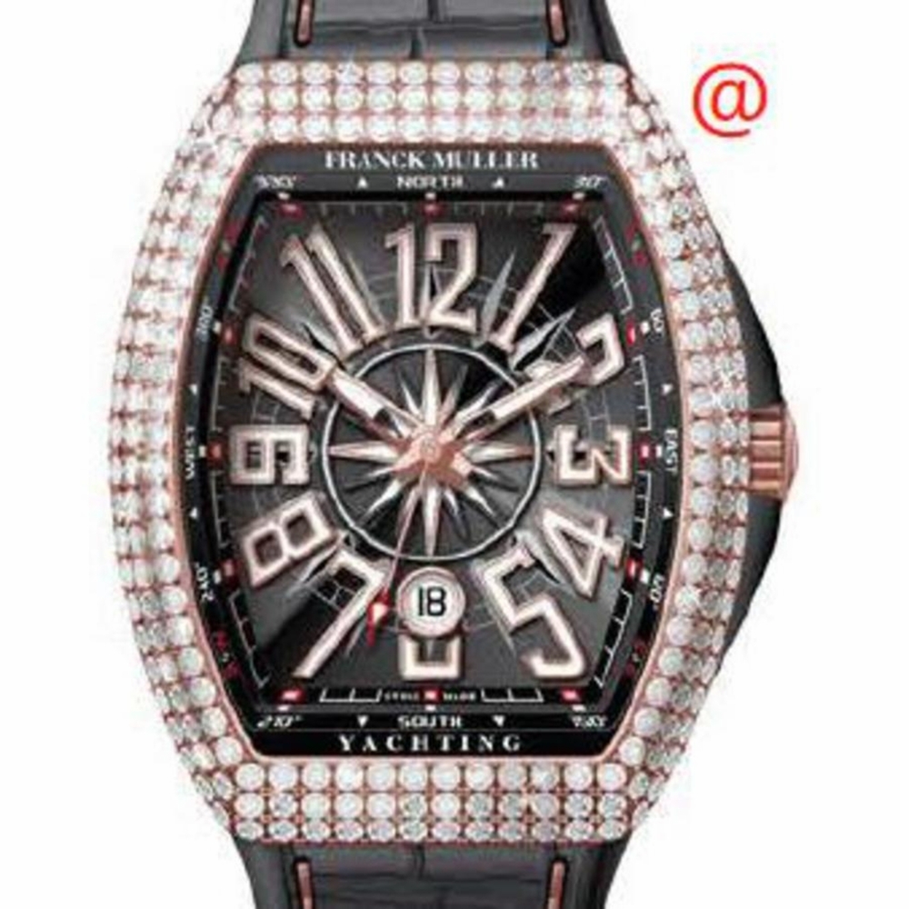 Rose gold-tone 18kt rose gold case with a black alligator band. Fixed rose gold-tone bezel with diamond set 18kt rose gold. Black dial with rose gold-tone hands and Arabic numeral hour markers. Minute markers around the outer rim. Dial Type: Analog. Luminescent hands and markers. Date display at the 6 o'clock position. Automatic movement. Scratch resistant sapphire crystal. Tonneau case shape, case size: 45 mm. Functions: date, hour, minute, second. Additional Info: original box, international warranty card, manual (complete accessories). Vanguard Yachting Series. Luxury watch style. Watch label: Swiss Made. Franck Muller Vanguard Yachting Automatic Diamond Black Dial Mens Watch V45SCDTDYACHTING5NNR(NRBLC5N).