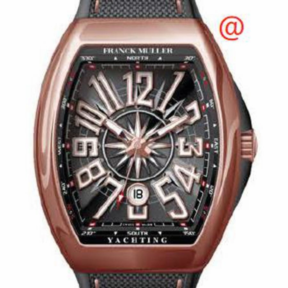Rose gold-tone 18kt rose gold case with a black alligator band. Fixed rose gold-tone 18kt rose gold bezel. Black dial with rose gold-tone hands and Arabic numeral hour markers. Minute markers around the outer rim. Dial Type: Analog. Luminescent hands and markers. Date display at the 6 o'clock position. Automatic movement. Scratch resistant sapphire crystal. Tonneau case shape, case size: 45 mm. Functions: date, hour, minute, second. Additional Info: original box, international warranty card, manual (complete accessories). Vanguard Yachting Series. Luxury watch style. Watch label: Swiss Made. Franck Muller Vanguard Yachting Automatic Black Dial Mens Watch V45SCDTYACHTING5NNR(NRBLC5N).