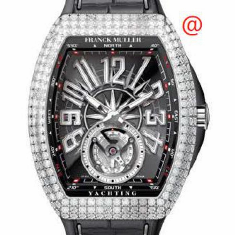 Silver-tone stainless steel case with a black alligator band. Fixed silver-tone bezel with diamond set stainless steel. Black dial with silver-tone hands and Arabic numeral hour markers. Minute markers around the outer rim. Dial Type: Analog. Luminescent hands and markers. Hand wind movement. Scratch resistant sapphire crystal. Transparent see through case back. Tonneau case shape, case size: 45 mm. Functions: hour, minute, second. Additional Info: original box, international warranty card, manual (complete accessories). Vanguard Yachting Tourbillon Series. Luxury watch style. Watch label: Swiss Made. Franck Muller Vanguard Yachting Tourbillon Hand Wind Diamond Black Dial Mens Watch V45TDYACHTINGACNR(NRBLCAC).