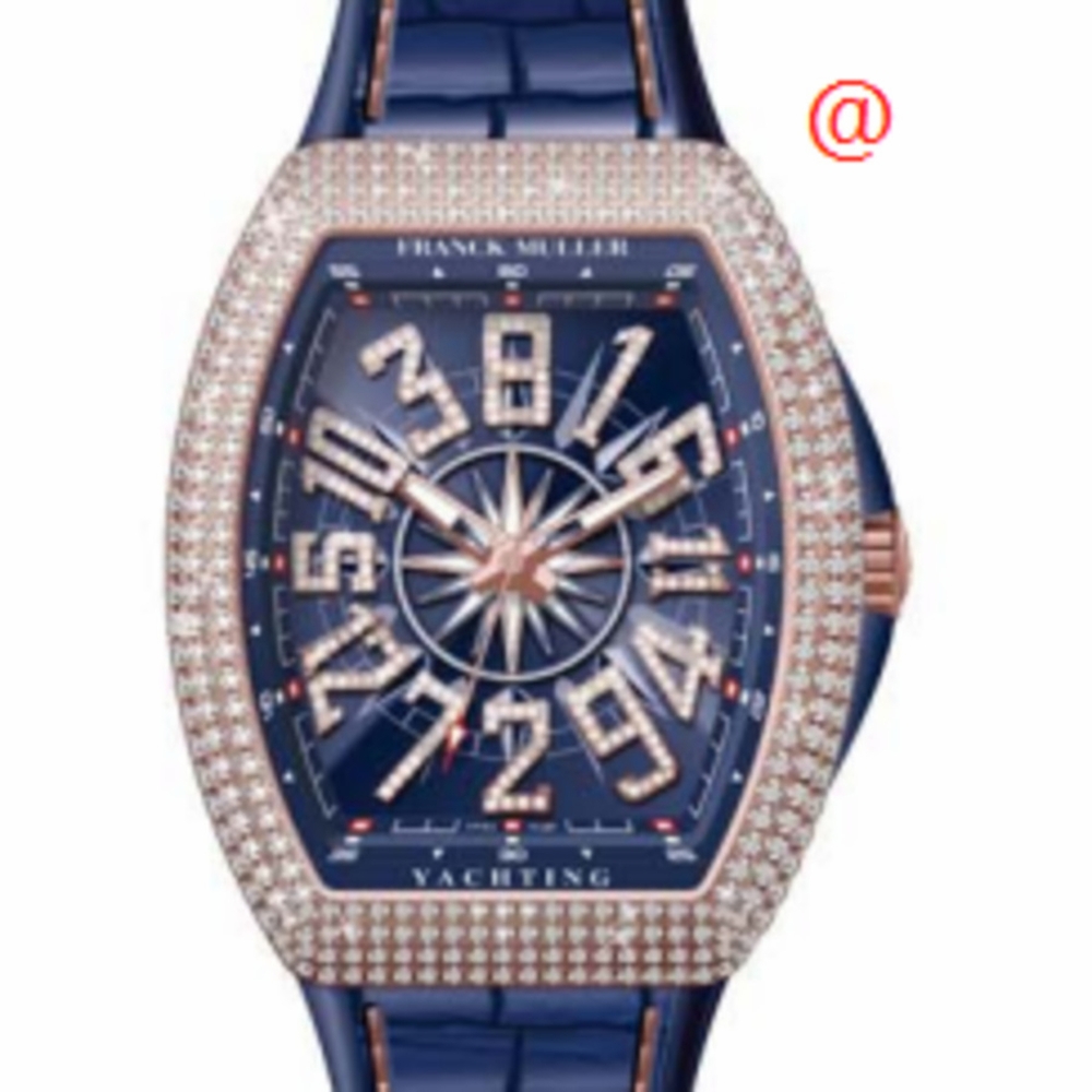 Rose gold-tone 18kt rose gold case with a blue alligator band. Fixed rose gold-tone bezel with diamond set 18kt rose gold. Blue dial with rose gold-tone hands and Arabic numeral hour markers. Minute markers around the outer rim. Dial Type: Analog. Luminescent hands and markers. Automatic movement. Scratch resistant sapphire crystal. Tonneau case shape, case size: 41 mm. Functions: hour, minute, second. Additional Info: original box, international warranty card, manual (complete accessories). Vanguard Yachting Series. Luxury watch style. Watch label: Swiss Made. Franck Muller Vanguard Yachting Automatic Diamond Blue Dial Mens Watch V41CHDNBRCDYACHTING5NBL(BLDIAM5N).