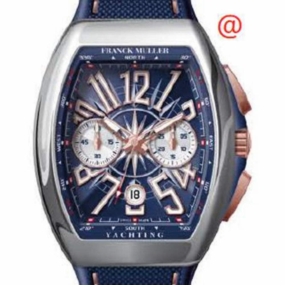 Silver-tone stainless steel case with a blue alligator band. Fixed silver-tone stainless steel bezel. Blue dial with rose gold-tone hands and Arabic numeral hour markers. Minute markers around the outer rim. Dial Type: Analog. Luminescent hands and markers. Date display at the 6 o'clock position. Chronograph - two sub-dials displaying: 60 second and 30 minute. Automatic movement. Scratch resistant sapphire crystal. Tonneau case shape, case size: 45 mm. Functions: chronograph, date, hour, minute, second. Additional Info: original box, international warranty card, manual (complete accessories). Vanguard Yachting Series. Luxury watch style. Watch label: Swiss Made. Franck Muller Vanguard Yachting Chronograph Automatic Blue Dial Mens Watch V45CCDTYACHTINGSTGACBL(BLBLC5N).