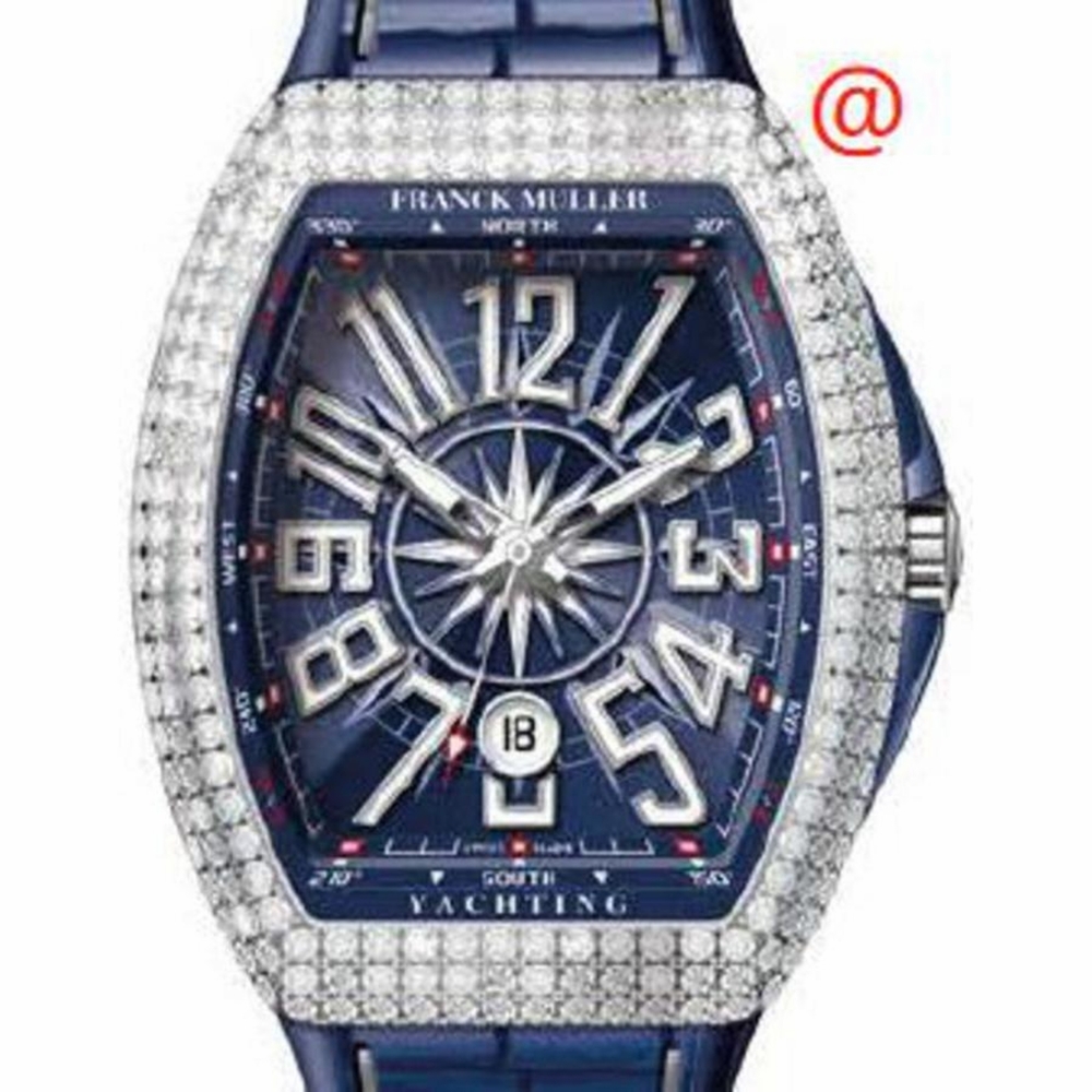 Silver-tone stainless steel case with a blue alligator band. Fixed silver-tone bezel with diamond set stainless steel. Blue dial with silver-tone hands and Arabic numeral hour markers. Minute markers around the outer rim. Dial Type: Analog. Luminescent hands and markers. Date display at the 6 o'clock position. Automatic movement. Scratch resistant sapphire crystal. Tonneau case shape, case size: 45 mm. Functions: date, hour, minute, second. Additional Info: original box, international warranty card, manual (complete accessories). Vanguard Yachting Series. Luxury watch style. Watch label: Swiss Made. Franck Muller Vanguard Yachting Automatic Diamond Blue Dial Mens Watch V45SCDTDYACHTINGACBL(BLBLCAC).