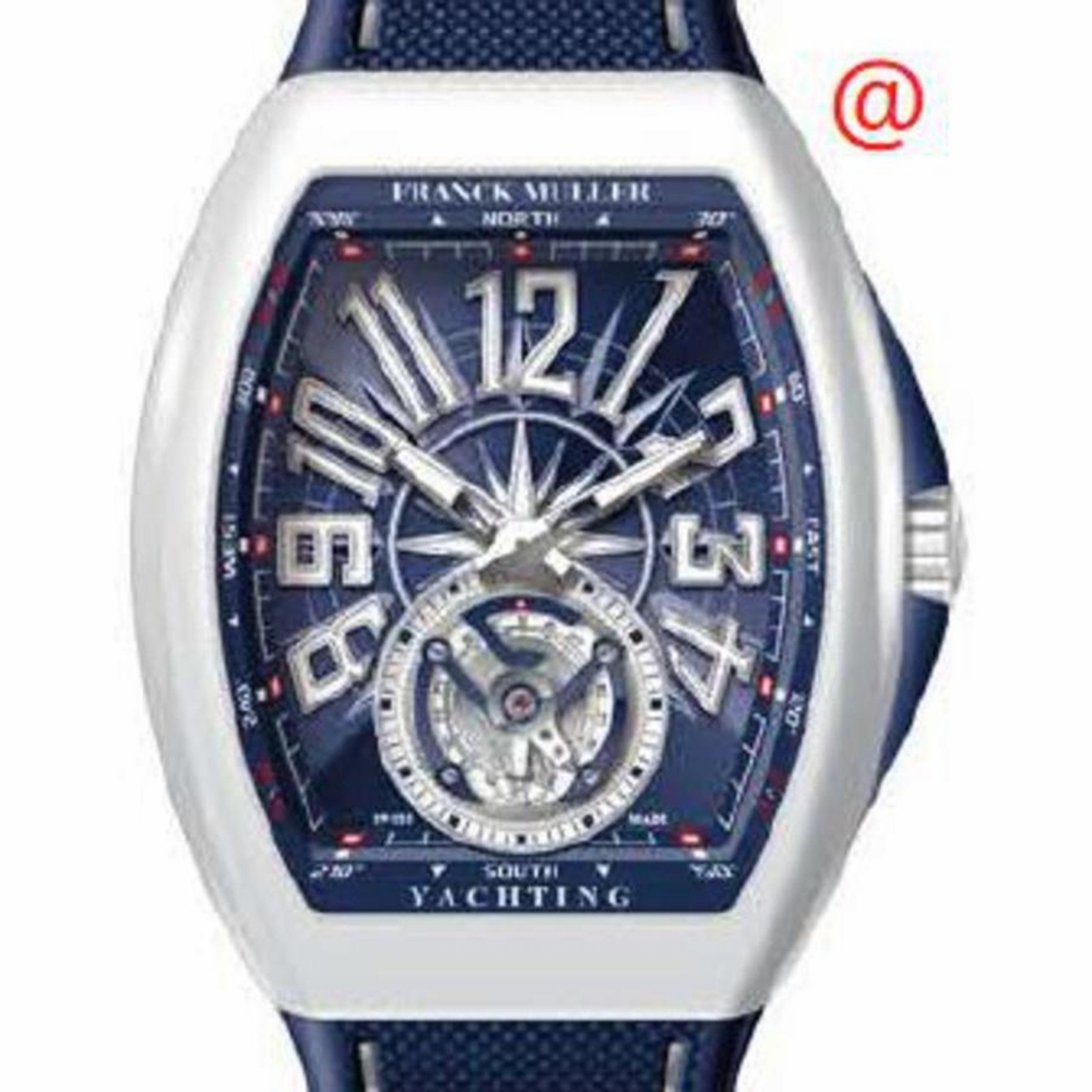 Silver-tone stainless steel case with a blue alligator band. Fixed silver-tone stainless steel bezel. Blue dial with silver-tone hands and Arabic numeral hour markers. Minute markers around the outer rim. Dial Type: Analog. Luminescent hands and markers. Hand wind movement. Scratch resistant sapphire crystal. Transparent see through case back. Tonneau case shape, case size: 45 mm. Functions: hour, minute, second. Additional Info: original box, international warranty card, manual (complete accessories). Vanguard Yachting Tourbillon Series. Luxury watch style. Watch label: Swiss Made. Franck Muller Vanguard Yachting Tourbillon Hand Wind Blue Dial Mens Watch V45TYACHTINGMTBCBL(BLBLCAC).