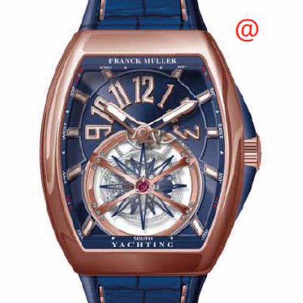 Rose gold-tone 18kt rose gold case with a blue leather strap. Fixed rose gold-tone 18kt rose gold bezel. Blue dial with rose gold-tone hands and Arabic numeral hour markers. Dial Type: Analog. Luminescent hands and markers. Automatic movement. Scratch resistant sapphire crystal. Transparent see through case back. Tonneau case shape, case size: 46 mm. Functions: hour, minute, second. Additional Info: original box, international warranty card, manual (complete accessories). Vanguard Yachting Series. Luxury watch style. Watch label: Swiss Made. Franck Muller Vanguard Yachting Automatic Blue Dial Mens Watch V50LTGRCSYACHTING(5NBL).