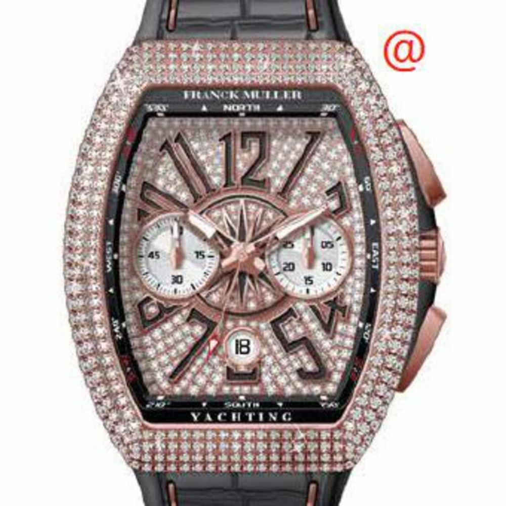 Rose gold-tone 18kt rose gold case with a black alligator band. Fixed rose gold-tone bezel with diamond set 18kt rose gold. Rose gold-tone dial with rose gold-tone hands and Arabic numeral hour markers. Dial Type: Analog. Luminescent hands and markers. Date display at the 6 o'clock position. Chronograph - two sub-dials displaying: 60 second and 30 minute. Automatic movement. Scratch resistant sapphire crystal. Tonneau case shape, case size: 45 mm. Functions: chronograph, date, hour, minute, second. Additional Info: original box, international warranty card, manual (complete accessories). Vanguard Yachting Series. Luxury watch style. Watch label: Swiss Made. Franck Muller Vanguard Yachting Chronograph Automatic Diamond Rose Gold Dial Mens Watch V45CCDTDCDYACHTING5NNR(DIAMNR5N).