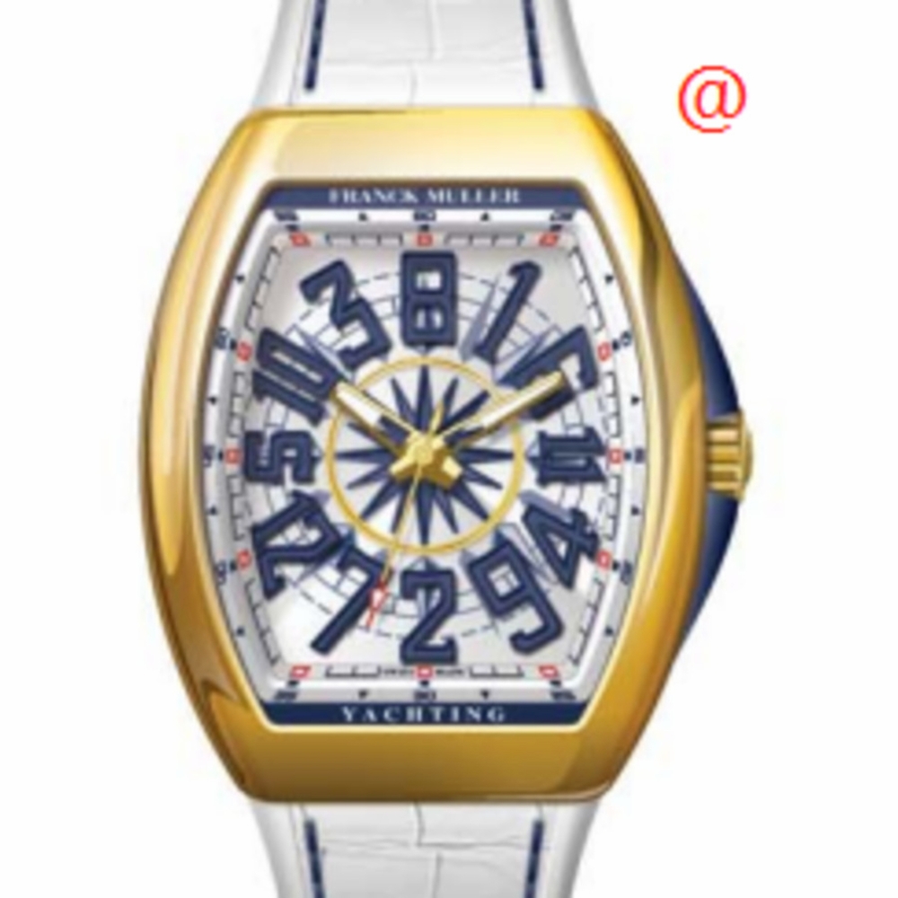 Yellow gold-tone 18kt yellow gold case with a white alligator band. Fixed yellow gold-tone 18kt yellow gold bezel. Silver-tone dial with yellow gold-tone hands and Arabic numeral hour markers. Minute markers around the outer rim. Dial Type: Analog. Luminescent hands and markers. Automatic movement. Scratch resistant sapphire crystal. Tonneau case shape, case size: 41 mm. Functions: hour, minute, second. Additional Info: original box, international warranty card, manual (complete accessories). Vanguard Yachting Series. Luxury watch style. Watch label: Swiss Made. Franck Muller Vanguard Yachting Automatic Silver Dial Mens Watch V41CHYACHTING3NBL(BLCBL).