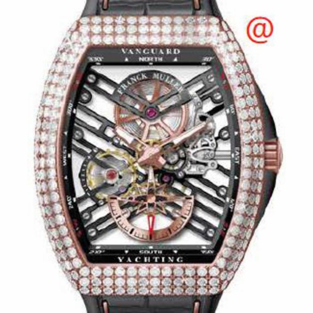 Rose gold-tone 18kt rose gold case with a black alligator band. Fixed rose gold-tone bezel with diamond set 18kt rose gold. Transparent dial with rose gold-tone hands and index hour markers. Dial Type: Analog. Luminescent hands and markers. Hand wind movement. Scratch resistant sapphire crystal. Transparent see through case back. Tonneau case shape, case size: 45 mm. Functions: hour, minute, second. Additional Info: original box, international warranty card, manual (complete accessories). Vanguard Yachting Series. Luxury watch style. Watch label: Swiss Made. Franck Muller Vanguard Yachting Hand Wind Diamond Mens Watch V45S6SQTDYACHTING5NNR(NRBLCRGE).