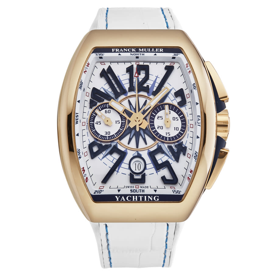 Rose gold-tone 18kt rose gold case with a white rubber strap. Fixed rose gold-tone 18kt rose gold bezel. White dial with rose gold-tone hands and Arabic numeral hour markers. Minute markers around the outer rim. Dial Type: Analog. Luminescent hands and markers. Date display at the 6 o'clock position. Chronograph - two sub-dials displaying: 60 second and 30 minute. Automatic movement. Scratch resistant sapphire crystal. Screw down crown. Solid case back. Tonneau case shape, case size: 45 mm, case thickness: 16 mm. Band width: 27 mm, band length: 8 inches. Buckle clasp. Water resistant at 30 meters / 100 feet. Functions: chronograph, date, hour, minute, second. Additional Info: chronograph, hours, minute, second, date. Vanguard Yachting Series. Luxury watch style. Watch label: Swiss Made. Franck Muller Vanguard Yachting Chronograph Automatic White Dial Mens Watch 45CCYACHTGLDWHT.