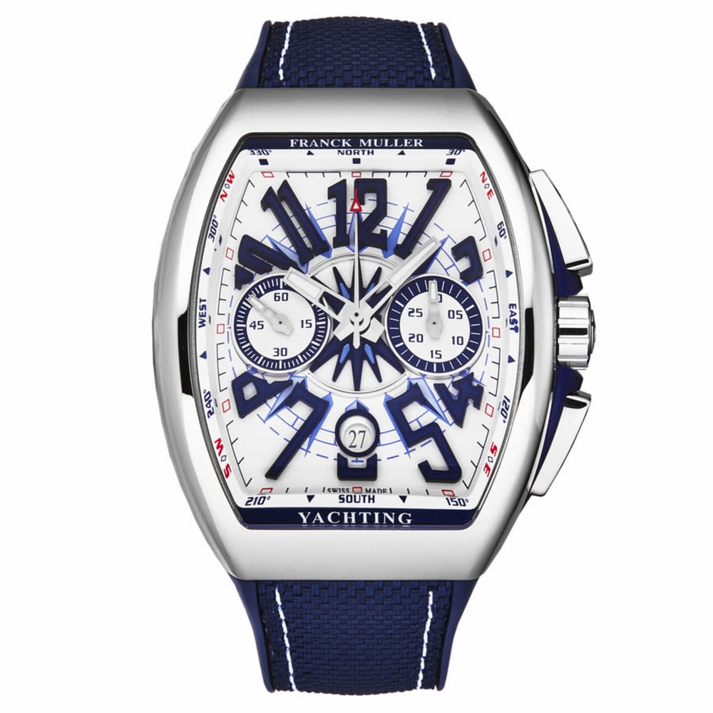 Silver-tone stainless steel case with a blue rubber strap. Fixed silver-tone stainless steel bezel. White dial with silver-tone hands and Arabic numeral hour markers. Minute markers around the outer rim. Dial Type: Analog. Luminescent hands and markers. Date display at the 6 o'clock position. Chronograph - two sub-dials displaying: 60 second and 30 minute. Automatic movement. Scratch resistant sapphire crystal. Screw down crown. Solid case back. Tonneau case shape, case size: 45 mm, case thickness: 16 mm. Band width: 27 mm, band length: 8 inches. Deployment with push button release clasp. Water resistant at 30 meters / 100 feet. Functions: chronograph, date, hour, minute, second. Additional Info: chronograph, hours, minute, second, date. Vanguard Series. Luxury watch style. Watch label: Swiss Made. Franck Muller Vanguard Chronograph Automatic White Dial Mens Watch 45CCYACTWHTBLU1.