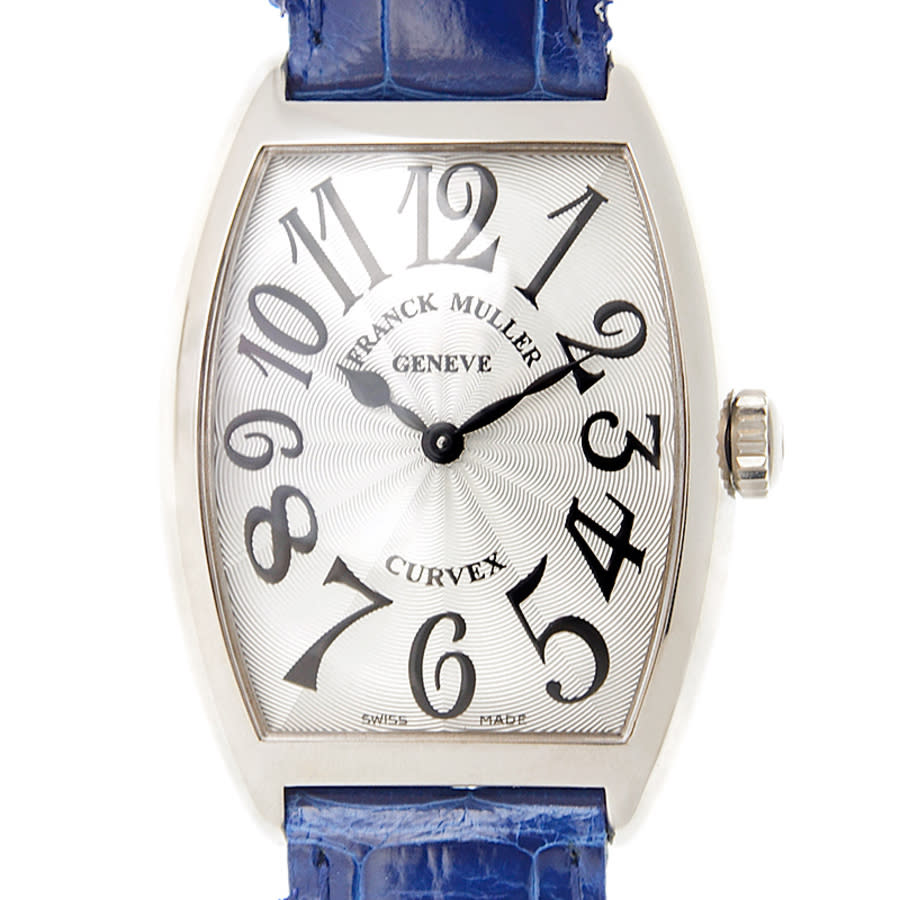 18kt white gold case with a blue alligator band. Fixed 18kt white gold bezel. White dial with Arabic numeral hour markers. Dial Type: Analog. Quartz movement. Scratch resistant sapphire crystal. Screw down crown. Solid case back. Tonneau case shape. Case size: 31 mm. Tang clasp. Water resistant at 30 meters / 100 feet. Functions: hour, minute, second. Additional Info: original box, international warranty card, manual (complete accessories). Luxury watch style. Watch label: Swiss Made. Franck Muller Cintree Curvex Quartz White Dial Ladies Watch 2852QZ(OG).
