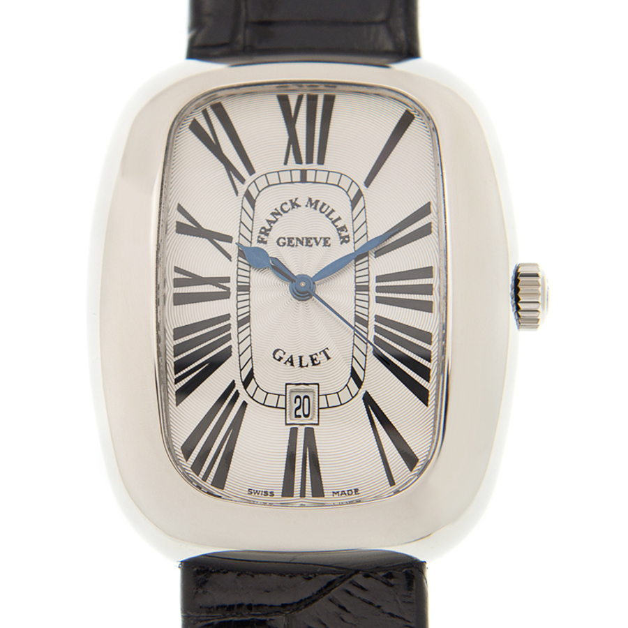 Silver-tone stainless steel case with a black alligator band. Fixed silver-tone stainless steel bezel. Silver-tone dial with blue spade-shaped hands and black Arabic numeral hour markers. Minute markers around the outer rim. Dial Type: Analog. Date display at the 6 o'clock position. Automatic movement. Scratch resistant sapphire crystal. Screw down crown. Solid case back. Rectangle case shape. Case size: 34 mm. Tang clasp. Water resistant at 30 meters / 100 feet. Functions: date, hour, minute, second. Additional Info: original box, international warranty card, manual (complete accessories). Luxury watch style. Watch label: Swiss Made. Franck Muller Galet Automatic Silver Dial Unisex Watch 3000 H SC DT R (AC).