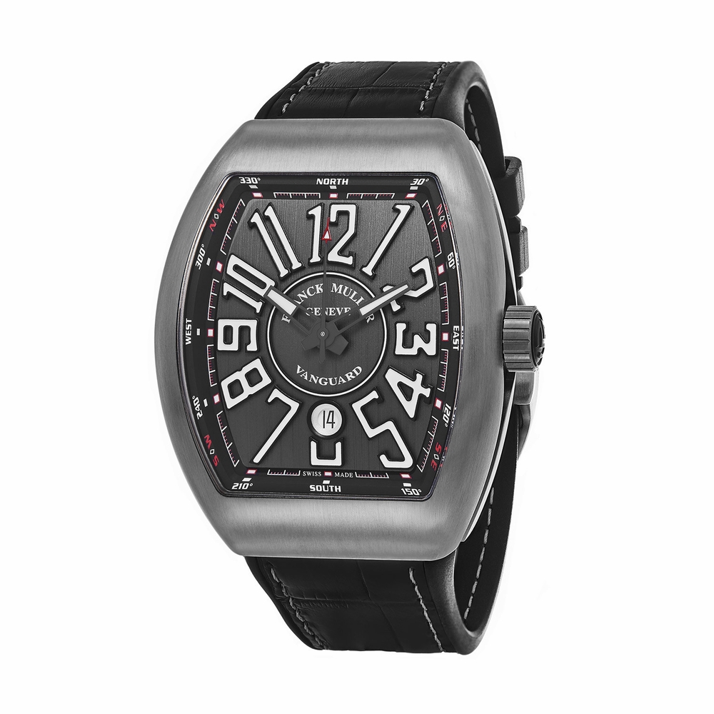 Titanium case with a black leather strap. Fixed bezel. Grey dial with Arabic numeral hour markers. Dial Type: Analog. Luminescent hands. Date display at the 6 o'clock position. Automatic movement with a 42-hour power reserve. Scratch resistant sapphire crystal. Screw down crown. Tonneau case shape, case size: 44 mm, case thickness: 13.5 mm. Deployment clasp. Water resistant at 30 meters / 100 feet. Functions: date, hour, minute, second. Luxury watch style. Watch label: Swiss Made. Franck Muller Vanguard Automatic Mens Watch 45SCTTBRNRGRYWH.