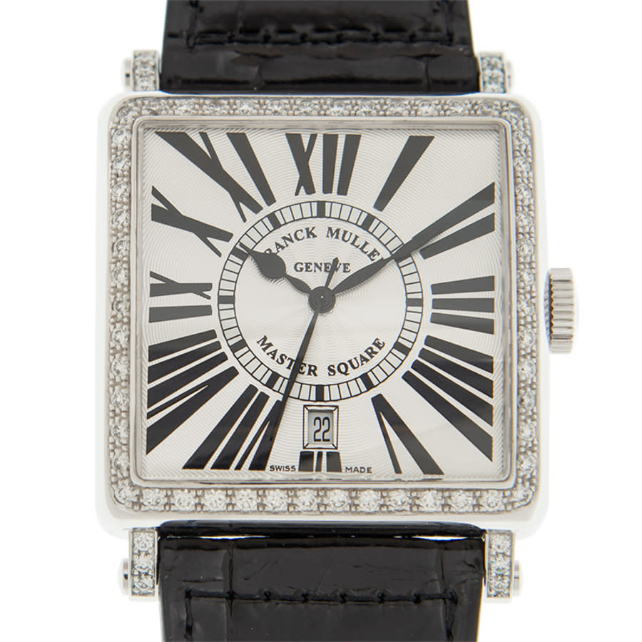 18kt white gold case with a black leather strap. Fixed 18kt white gold bezel. White dial with black hands and Roman numeral hour markers. Minute scale around the inner rim. Dial Type: Analog. Date display at the 6 o'clock position. Automatic movement. Scratch resistant sapphire crystal. Screw down crown. Solid case back. Square case shape. Case size: 35 mm. Buckle clasp. Water resistant at 30 meters / 100 feet. Functions: date, hour, minute, second. Additional Info: original box, international warranty card, manual (complete accessories). Luxury watch style. Watch label: Swiss Made. Franck Muller Master Square Automatic White Dial Unisex Watch 6000HSCDTRD1R(OG).