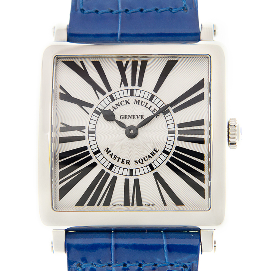 Silver-tone stainless steel case with a blue leather strap. Fixed silver-tone stainless steel bezel. Silver-tone dial with black spade-shaped hands and Roman numeral hour markers. Minute scale around the inner rim. Dial Type: Analog. Quartz movement. Scratch resistant sapphire crystal. Screw down crown. Solid case back. Square case shape, case size: 32.7 mm. Tang clasp. Water resistant at 30 meters / 100 feet. Functions: hour, minute. Additional Info: original box, international warranty card, manual (complete accessories). Master Square Series. Luxury watch style. Watch label: Swiss Made. Franck Muller Master Square Quartz Silver Dial Unisex Watch 6002 M QZ R (AC).