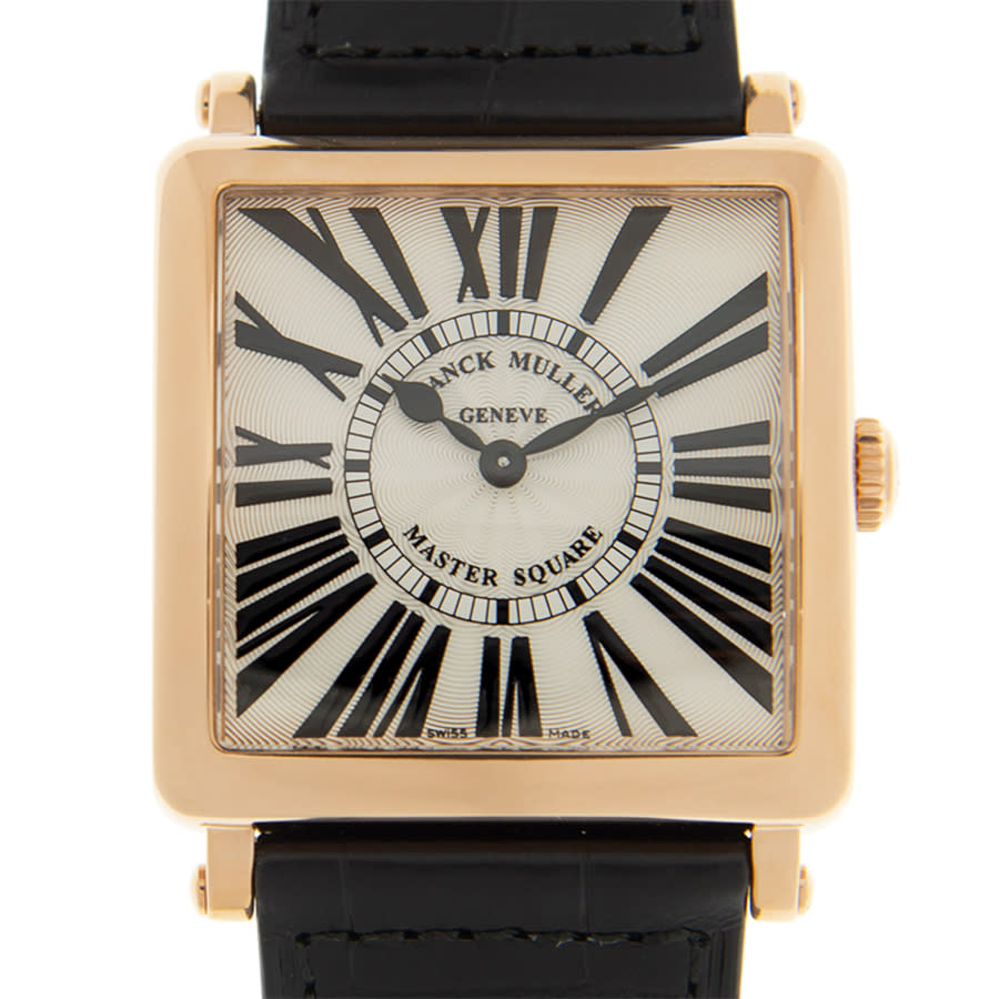 Rose gold-tone 18kt rose gold case with a black alligator band. Fixed rose gold-tone 18kt rose gold bezel. White dial with black hands and Roman numeral hour markers. Minute scale around the inner rim. Dial Type: Analog. Quartz movement. Scratch resistant sapphire crystal. Screw down crown. Solid case back. Square case shape. Case size: 32 mm. Buckle clasp. Water resistant at 30 meters / 100 feet. Functions: hour, minute. Additional Info: original box, international warranty card, manual (complete accessories). Luxury watch style. Watch label: Swiss Made. Franck Muller Master Square Quartz White Dial Unisex Watch 6002MBQZR(5N).