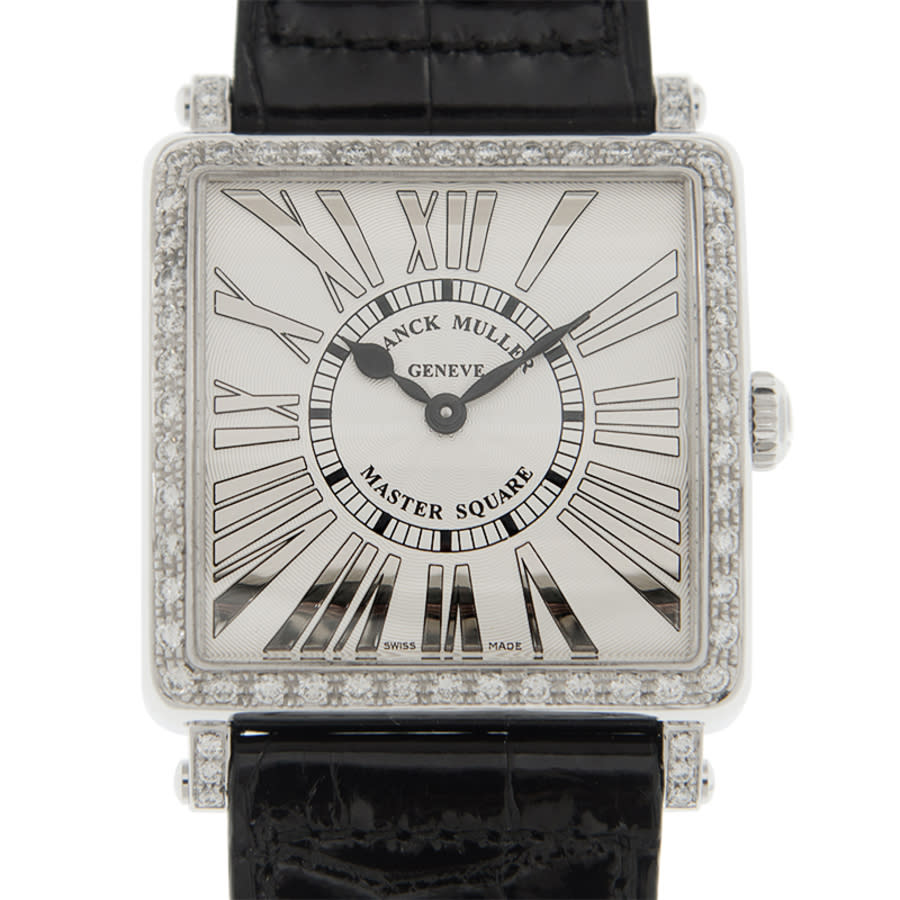 18kt white gold case with a brown leather strap. Fixed 18kt white gold diamond set bezel. White dial with black spade-shaped hands and Roman numeral hour markers. Minute scale around the inner rim. Dial Type: Analog. Quartz movement. Scratch resistant sapphire crystal. Solid case back. Square case shape. Case size: 33 mm. Tang clasp. Water resistant at 30 meters / 100 feet. Functions: hour, minute. Additional Info: original box, international warranty card, manual (complete accessories). Luxury watch style. Watch label: Swiss Made. Franck Muller Master Square Quartz Diamond White Dial Unisex Watch 6002MQZRELRD1R(OG).