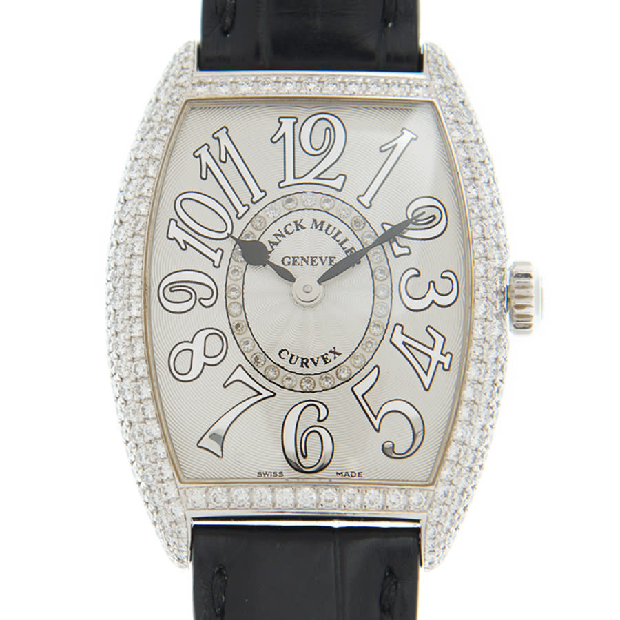 18kt white gold case with a black leather strap. Fixed 18kt white gold diamond set bezel. White dial with black spade-shaped hands and Arabic numeral hour markers. Diamond scale around the inner rim. Dial Type: Analog. Quartz movement. Scratch resistant sapphire crystal. Screw down crown. Solid case back. Tonneau case shape. Case size: 28 mm. Buckle clasp. Water resistant at 30 meters / 100 feet. Functions: hour, minute. Additional Info: original box, international warranty card, manual (complete accessories). Luxury watch style. Watch label: Swiss Made. Franck Muller Cintree Curvex Quartz Diamond White Dial Ladies Watch 7502QZDCD1R(OG).