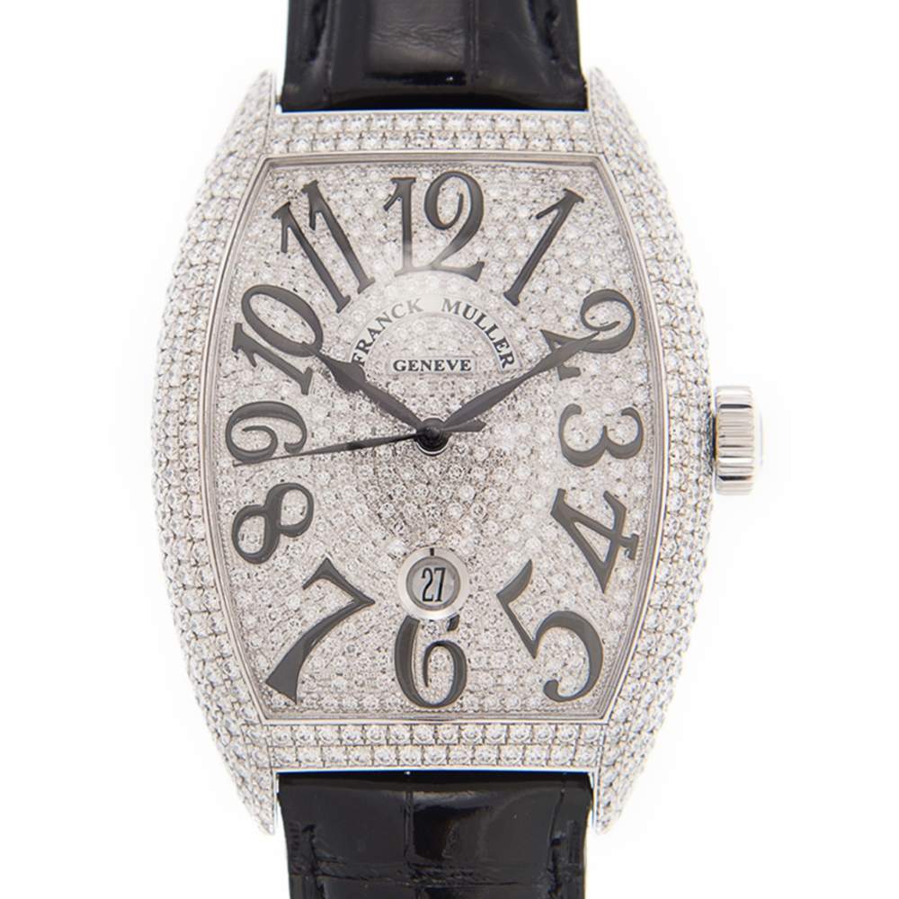 18kt white gold case with a black alligator band. Fixed silver-tone diamond set bezel. Diamond set dial with black hands and Arabic numeral hour markers. Dial Type: Analog. Date display at the 6 o'clock position. Automatic movement. Scratch resistant sapphire crystal. Screw down crown. Solid case back. Tonneau case shape. Case size: 39.5 mm. Tang clasp. Water resistant at 30 meters / 100 feet. Functions: date, hour, minute, second. Additional Info: original box, international warranty card, manual (complete accessories). Luxury watch style. Watch label: Swiss Made. Franck Muller Casablanca Automatic Diamond Unisex Watch 8880 SC DT D6 CD (OG).