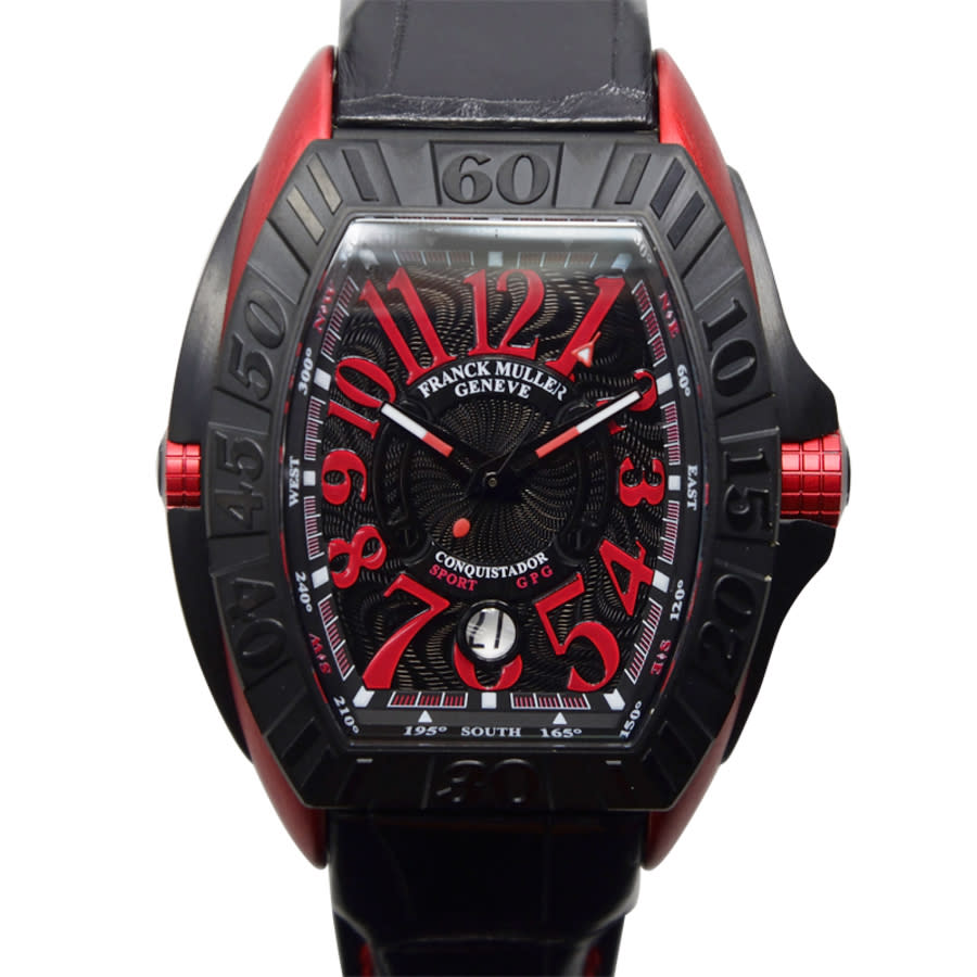 Black aluminum case with a black leather strap. Fixed black aluminum bezel. Black dial with Arabic numeral hour markers. Compass markers around the outer rim. Dial Type: Analog. Date display at the 6 o'clock position. Automatic movement. Scratch resistant sapphire crystal. Screw down crown. Solid case back. Tonneau case shape. Case size: 57 mm. Pin buckle clasp. Water resistant at 30 meters / 100 feet. Functions: date, hour, minute, second. Additional Info: original box, international warranty card, manual (complete accessories). Luxury watch style. Watch label: Swiss Made. Franck Muller Conquistador Grand Prix Automatic Black Dial Mens Watch 8900SCDTGPG(ER).