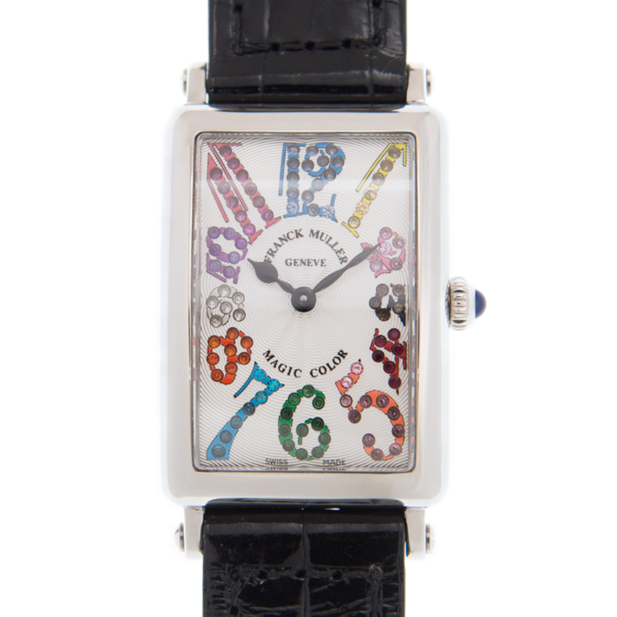 Silver-tone stainless steel case with a black alligator leather strap. Fixed silver-tone stainless steel bezel. White dial with black spade-shaped hands and multicolor Arabic numeral hour markers. Dial Type: Analog. Quartz movement. Scratch resistant sapphire crystal. Screw down crown. Solid case back. Rectangle case shape. Case size: 22.9 mm. Pin buckle clasp. Water resistant at 30 meters / 100 feet. Functions: hour, minute. Additional Info: original box, international warranty card, manual (complete accessories). Luxury watch style. Watch label: Swiss Made. Franck Muller Long Island Quartz White Dial Unisex Watch 902 QZ MAG COL (AC).