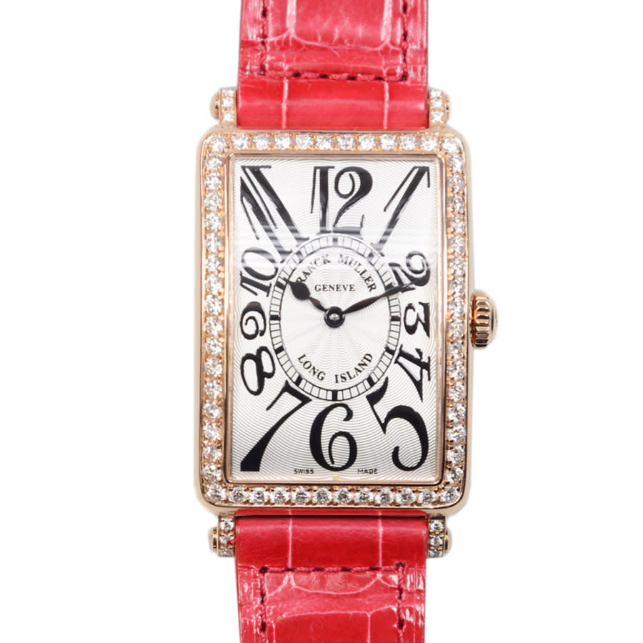 18kt rose gold case with a red alligator leather strap. Fixed 18kt rose gold diamond set bezel. Silver-tone dial with black spade-shaped hands and Roman numeral hour markers. Minute scale around the inner rim. Dial Type: Analog. Quartz movement. Scratch resistant sapphire crystal. Solid case back. Rectangle case shape. Case size: 26 mm. Pin buckle clasp. Water resistant at 30 meters / 100 feet. Functions: hour, minute. Additional Info: original box, international warranty card, manual (complete accessories). Luxury watch style. Watch label: Swiss Made. Franck Muller Long Island Quartz Diamond Silver Dial Ladies Watch 952QZD1R(5N).