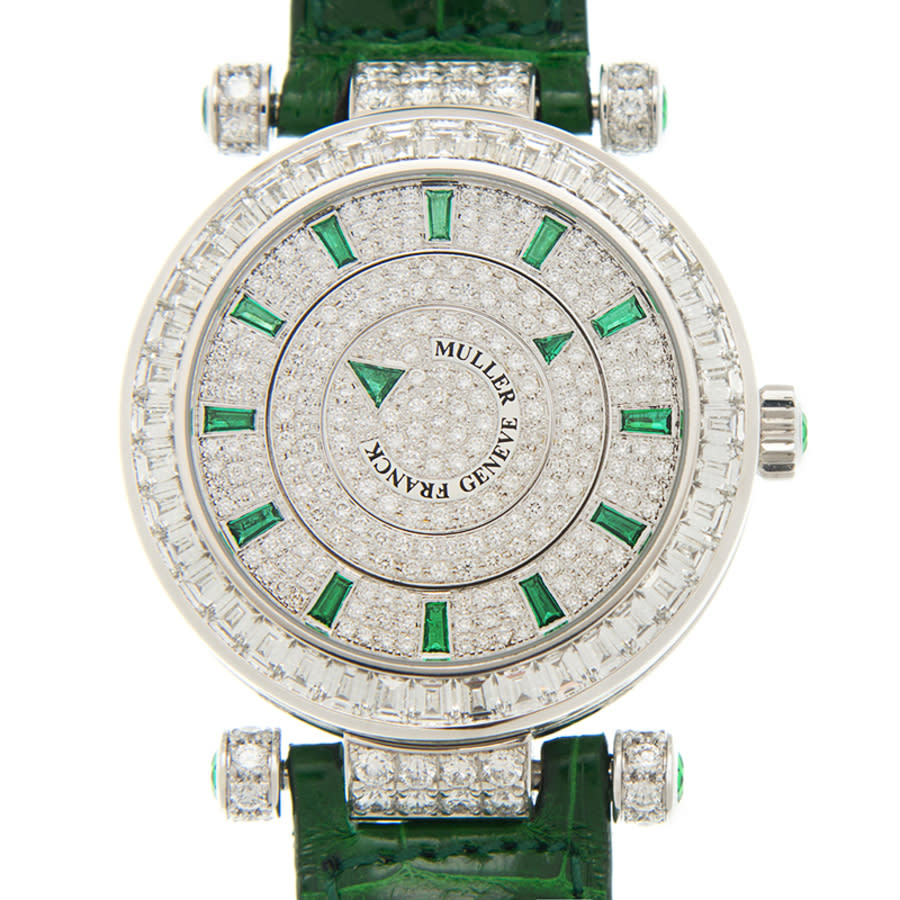 18kt white gold case with a green alligator leather strap. Fixed 18kt white gold diamond set bezel. Silver-tone dial with green hands and diamond hour markers. Dial Type: Analog. Automatic movement. Scratch resistant sapphire crystal. Screw down crown. Transparent case back. Round case shape. Case size: 42 mm. Tang clasp. Functions: hour, minute. Additional Info: original box, international warranty card, manual (complete accessories). Luxury watch style. Watch label: Swiss Made. Franck Muller Round Automatic Diamond Silver Dial Mens Watch DBLMYSTBAGCBAG36(OG).
