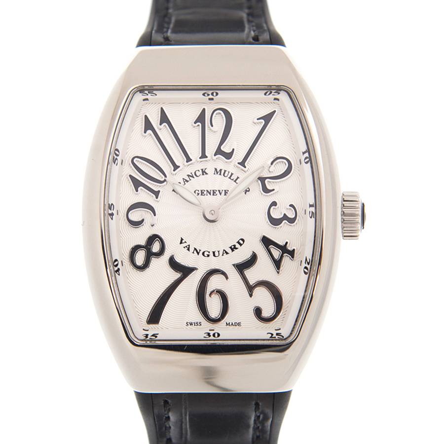 Silver-tone stainless steel case with a black alligator leather strap. Fixed silver-tone stainless steel bezel. White dial with silver-tone leaf-style shape hands and Arabic numeral hour markers. Dial Type: Analog. Luminescent hands. Quartz movement. Scratch resistant sapphire crystal. Screw down crown. Solid case back. Tonneau case shape. Case size: 29 mm. Pin buckle clasp. Water resistant at 30 meters / 100 feet. Functions: hour, minute. Additional Info: original box, international warranty card, manual (complete accessories). Luxury watch style. Watch label: Swiss Made. Franck Muller Vanguard Quartz White Dial Unisex Watch V 29 QZ (AC NR).