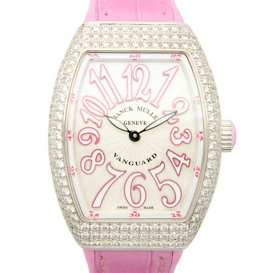 Silver-tone stainless steel case with a pink alligator leather strap. Fixed white diamond set bezel. Silver-tone dial with black leaf-style shape hands and Arabic numeral hour markers. Dial Type: Analog. Luminescent hands. Quartz movement. Scratch resistant sapphire crystal. Screw down crown. Solid case back. Tonneau case shape. Case size: 32 mm. Pin buckle clasp. Water resistant at 30 meters / 100 feet. Functions: hour, minute. Additional Info: original box, international warranty card, manual (complete accessories). Luxury watch style. Watch label: Swiss Made. Franck Muller Vanguard Quartz Diamond Silver Dial Unisex Watch V 32 QZ D (AC.RS).