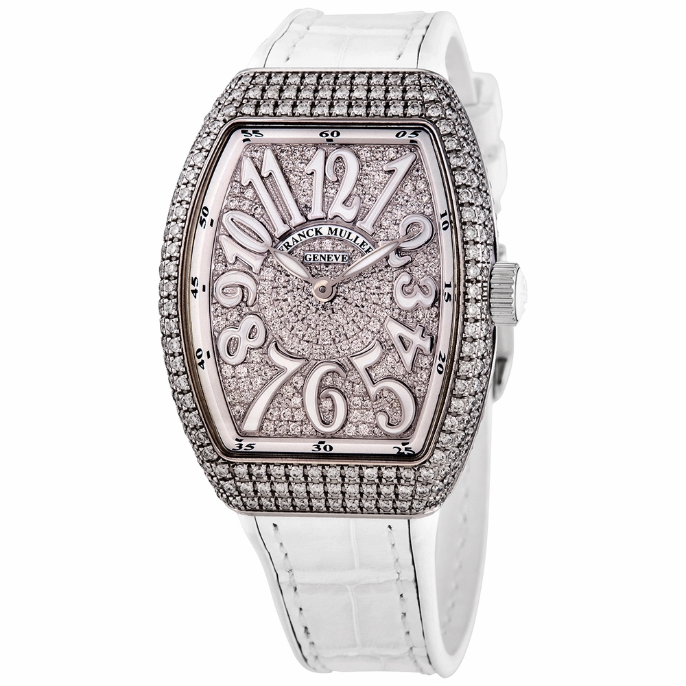18kt white gold case with a white alligator band. Fixed diamond set bezel. Silver-tone dial with Arabic numeral hour markers. Dial Type: Analog. Quartz movement. Scratch resistant sapphire crystal. Screw down crown. Solid case back. Tonneau case shape. Case size: 32 x 42 mm. Tang clasp. Water resistant at 30 meters / 100 feet. Functions: hour, minute. Additional Info: original box, international warranty card, manual (complete accessories). Luxury watch style. Watch label: Swiss Made. Franck Muller Vanguard Quartz Diamond Silver Dial Unisex Watch V 32 QZ D CD (OG.BC).