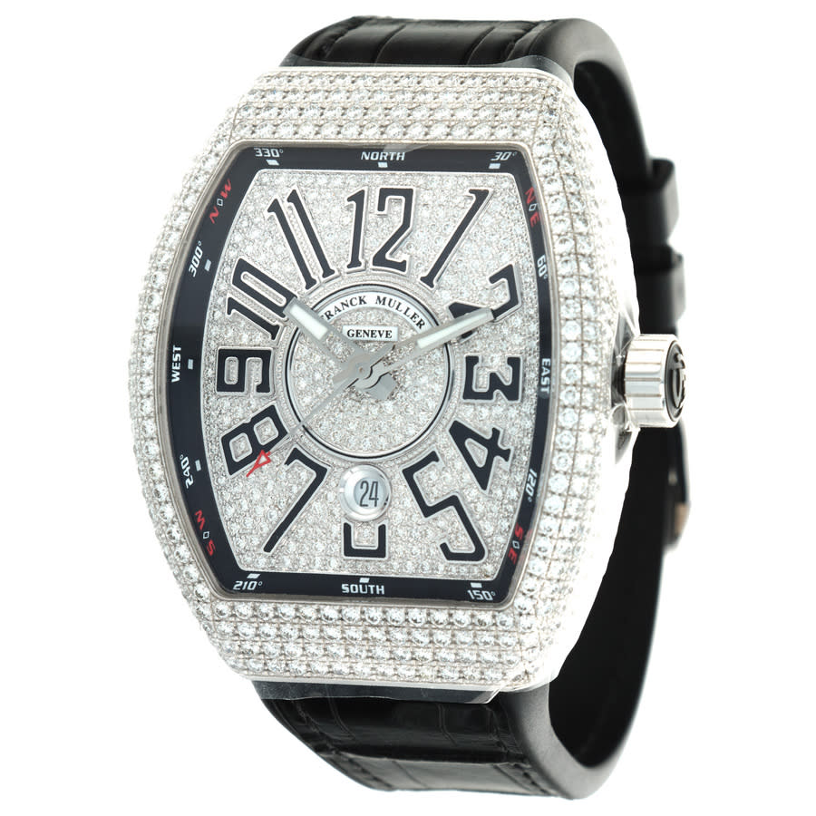18kt white gold case with a black crocodile leather strap. Fixed 18kt white gold diamond set bezel. White dial with white hands and Arabic numeral hour markers. Dial Type: Analog. Date display at the 6 o'clock position. Automatic movement. Screw down crown. Tonneau case shape. Case size: 44.3 mm. Water resistant at 30 meters / 100 feet. Functions: date, hour, minute, second. Luxury watch style. Watch label: Swiss Made. Franck Muller Vanguard Automatic White Dial Watch V45SCDDCDOGNR.