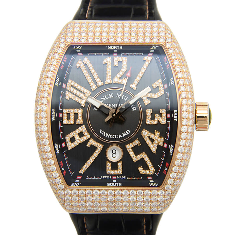 18kt rose gold case with a black leather strap. Fixed 18kt rose gold diamond set bezel. Black dial with gold-tone skeleton hands and Arabic numeral hour markers. Compass markers around the outer rim. Dial Type: Analog. Date display at the 6 o'clock position. Automatic movement. Scratch resistant sapphire crystal. Screw down crown. Solid case back. Tonneau case shape. Case size: 44 mm. Pin buckle clasp. Functions: date, hour, minute, second. Additional Info: original box, international warranty card, manual (complete accessories). Luxury watch style. Watch label: Swiss Made. Franck Muller Vanguard Automatic Diamond Black Dial Mens Watch V45SCDTDNBRCD(5NNR).